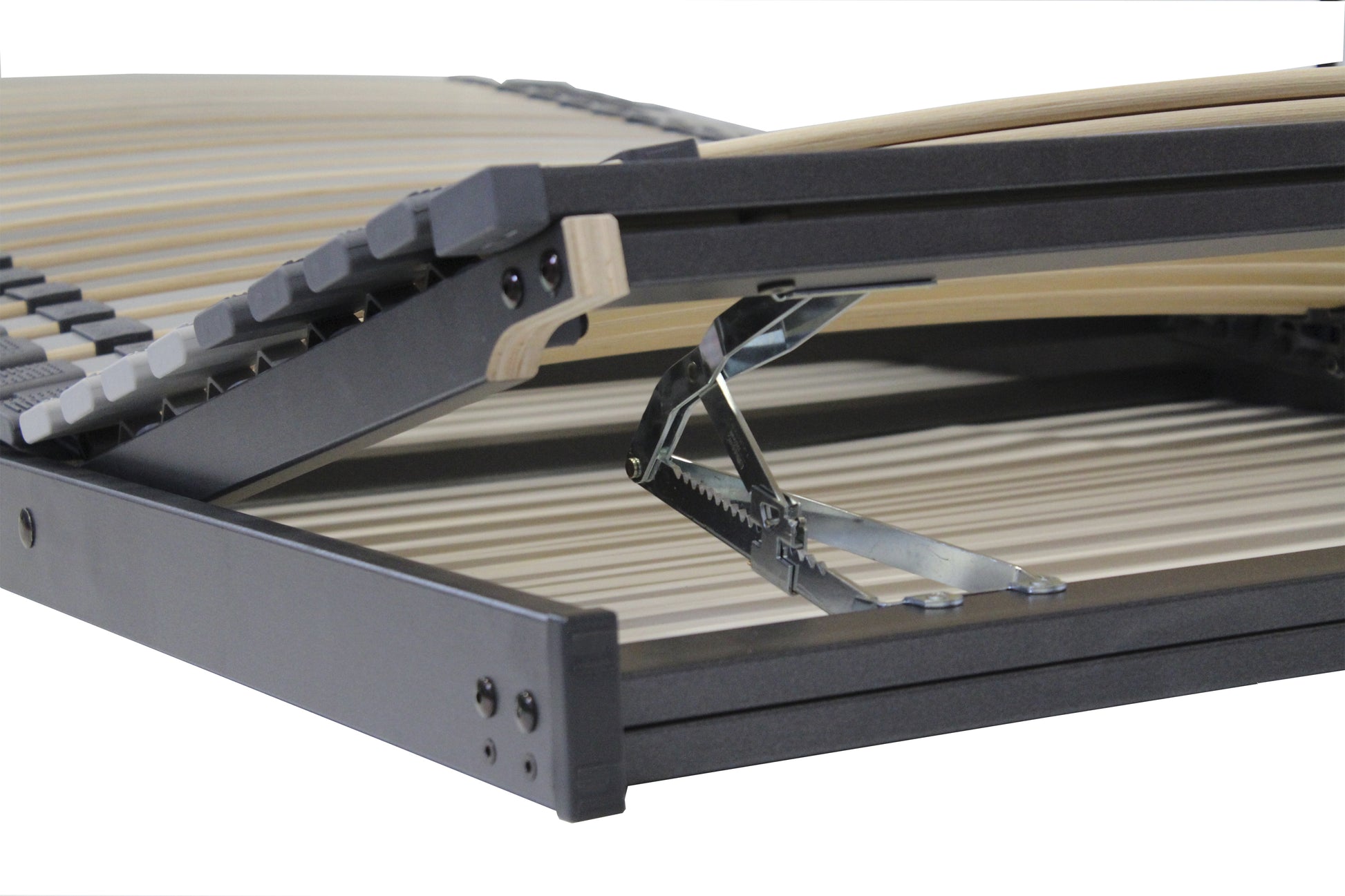 Der anthrazit-metallic ummantelte Rahmen und die carbon-dunkelgrauen Leisten machen dieses Lattenrost nicht nur funktional, sondern auch optisch zu einem Highlight im Schlafzimmer.